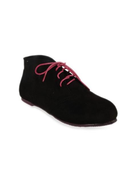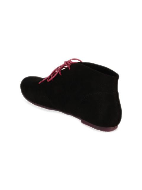 A couple of black casual shoes, has mid-beat styling, bind up detail.Synthetic suede upper.Cushioned footbed.Textured and designed outsole.